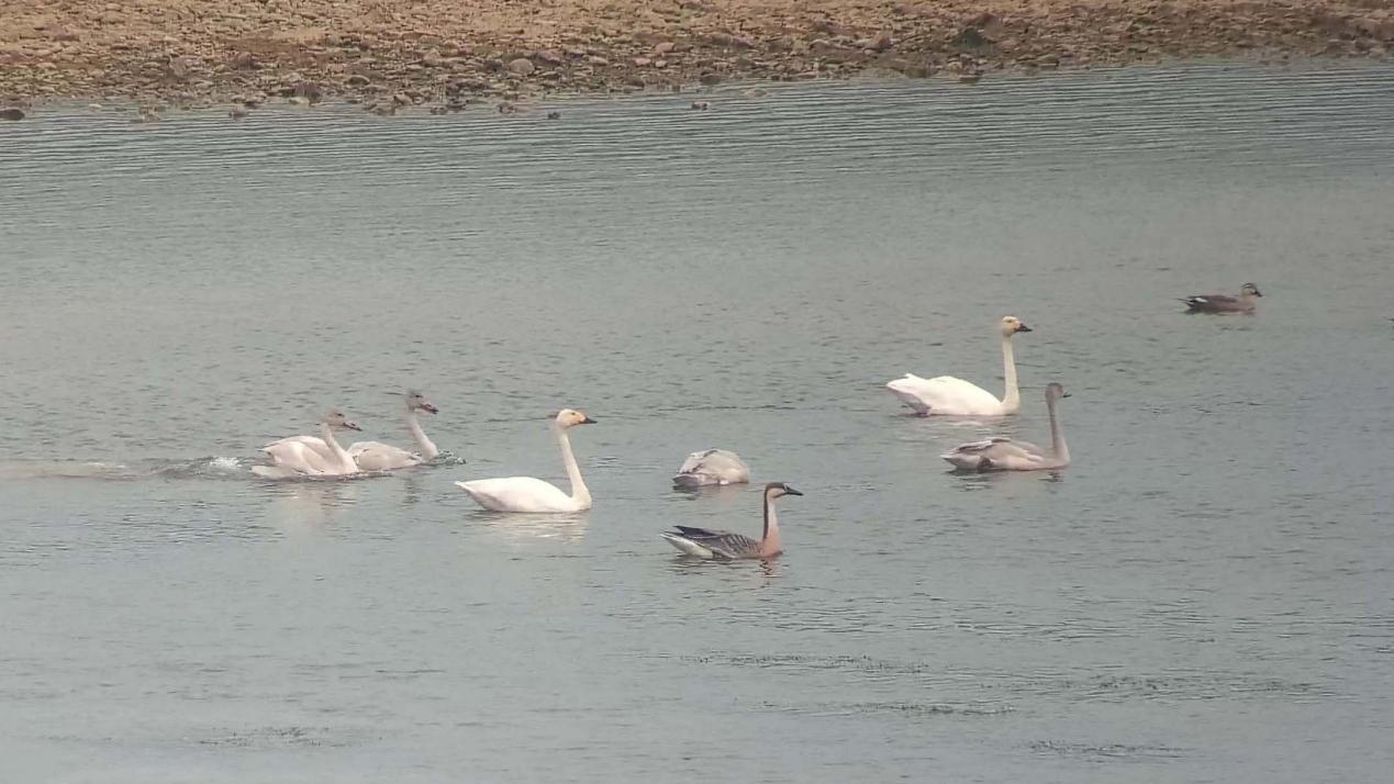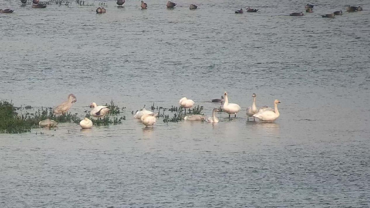 14只小天鹅在湿地浅滩旁觅食