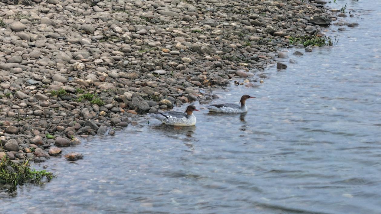 中华秋沙鸭在浅滩旁休憩