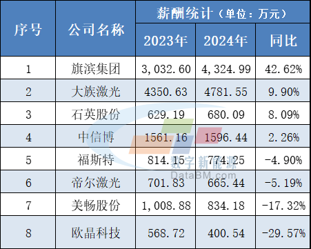 根据薪酬变动情况来看,旗滨集团的凌根略薪酬增幅最大为15031.33%,主要是由于其2023年在旗滨集团担任副总裁之时仅领取了1个月的工资,2023.12.27-2023.12.31任职期间其未领取该公司董事、高管的薪酬。