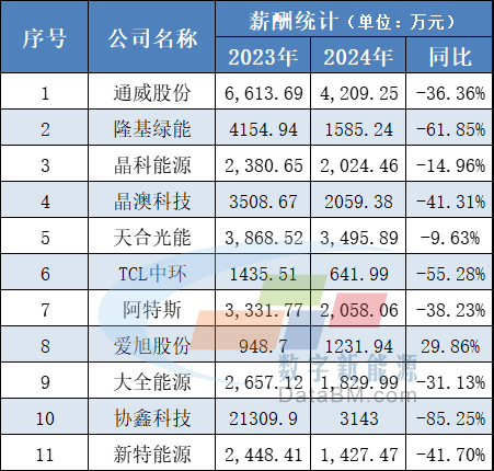 在统计的11家主产业链头部企业中聚宏鑫操盘,数字新能源DataBM.com梳理出了61位高管薪酬变化情况。由于TCL中环(002129)董事长李东升、晶科能源董事长李仙德以及阿特斯董事长瞿晓铧均不在上市公司领取报酬,故不在此次梳理范围。