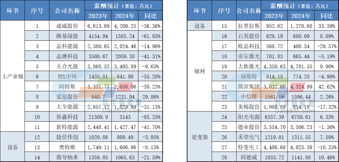 数字新能源DataBM.com梳理了28家各生产环节的头部企业高管百余名高管的薪酬发现,2024年有近7成的光伏企业董监高薪酬合计(指董事、监事以及高管薪酬合计)支出所有下降,其中有“光伏茅”之称隆基绿能(601012)降幅最大,达61.85%;在不到3成的董监高薪酬合计支出上升的企业中,旗滨集团(601636)涨幅最高,达42.62%。