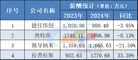 统计的4家设备企业,有3家企业的2024年董监高薪酬合计同比出现不同程度下滑,而拉普拉斯却逆势增长了33.39%。
