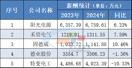 在此次统计范围内的5家逆变器企业中,只有德业股份和特变电工(600089)的董监高薪酬合计同比出现下滑,其中特变电工降幅最大,达10.33%;其余企业均呈现不同程度的增长。