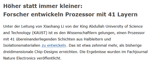 据CNMO了解,该方案由阿卜杜拉国王科技大学(KAUST)李晓航教授提出,新型处理器由41层交错堆叠的半导体与绝缘材料构成。《自然-电子学》期刊发表的研究成果显示,这一数据达到现有三维芯片设计方案的十倍。