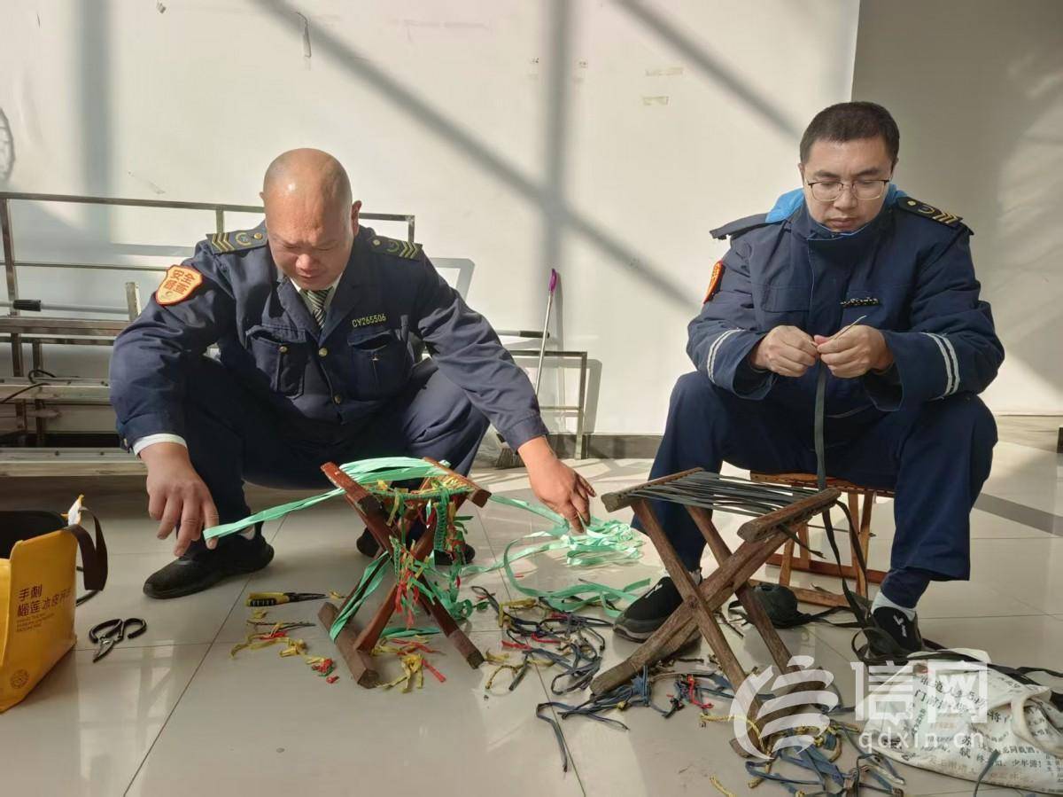 耿生宏(左)和姬力生(右)为居民换马扎绳。(来源:信网)