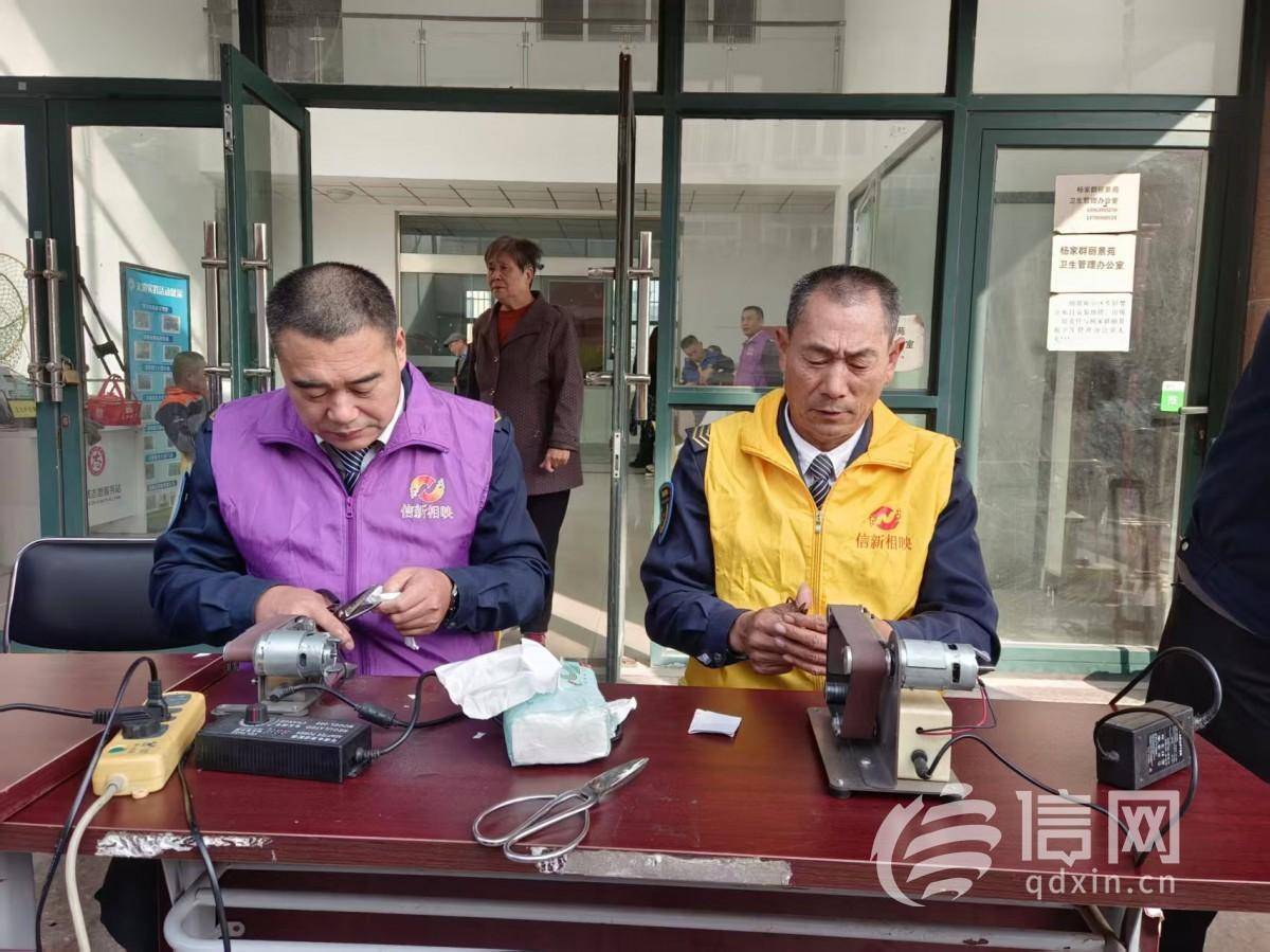 徐洪洋(左)和肖承乐(右)为居民磨刀。(来源:信网)